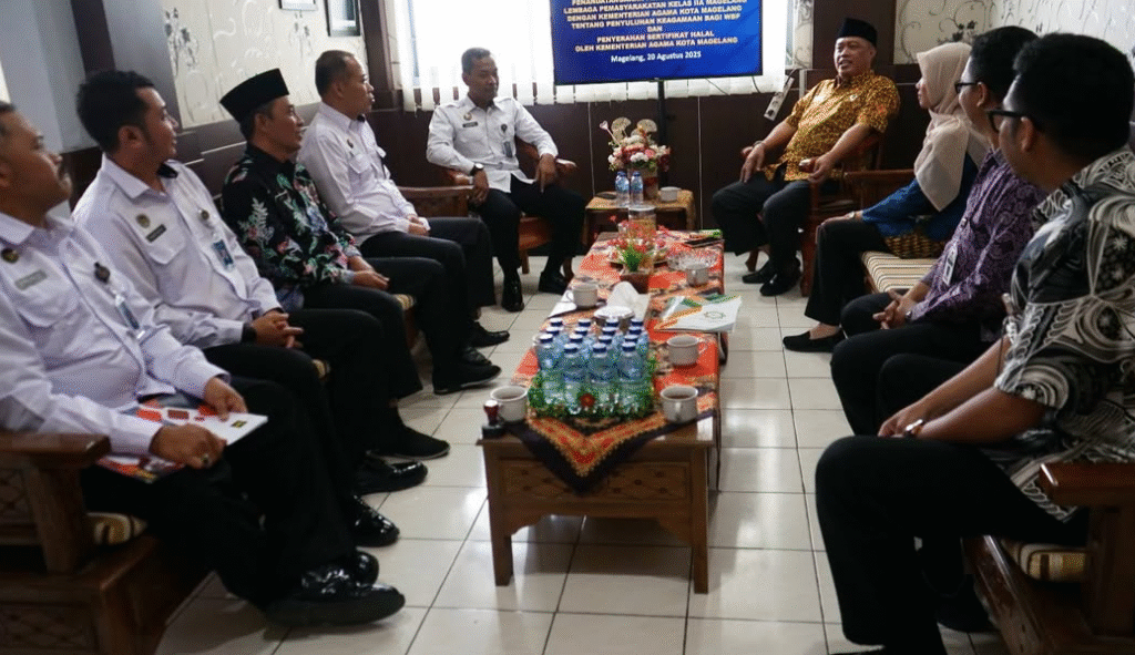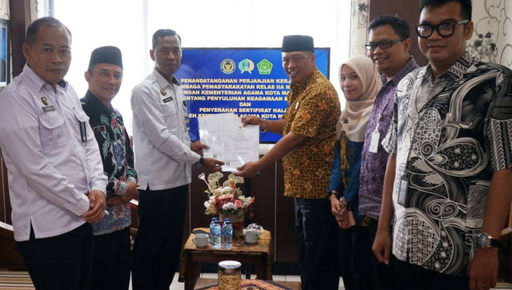 Kota Magelang (Humas) – Kepala Lembaga Pemasyarakatan (Lapas) Kelas IIB Magelang, Agung Supriyanto, menerima secara langsung empat sertifikat halal dalam sebuah acara resmi yang berlangsung di ruang kerjanya, Rabu (20/8/2025). Penyerahan ini dilakukan oleh Kepala Kemenag Kota Magelang, HM. Soleh Mubin, yang hadir bersama Penyelenggara Zakat dan Wakaf H. Abdul Haris TKE, Pengawas Produk Halal Fadilla Panca, serta perwakilan dari Disperindag Kota Magelang.