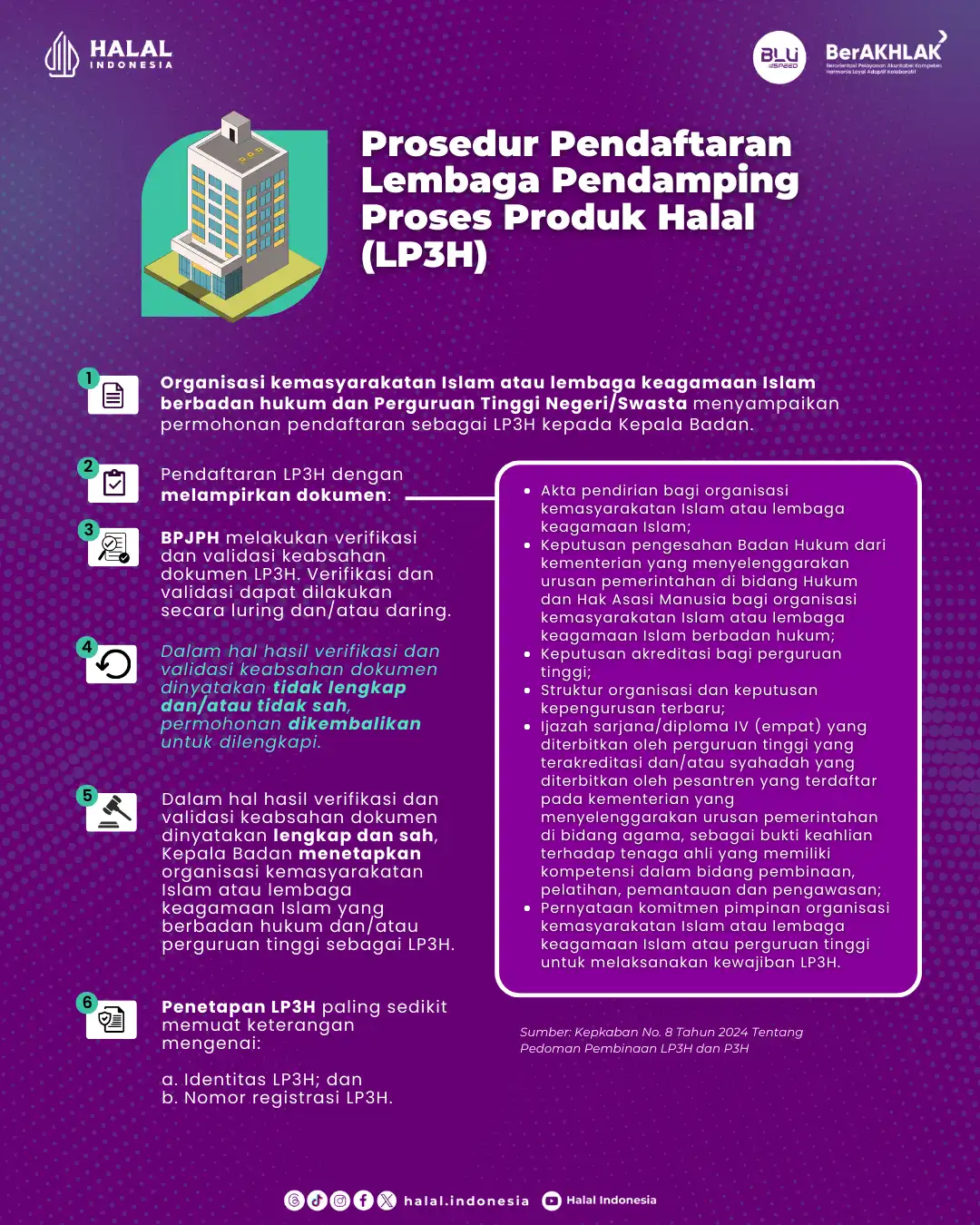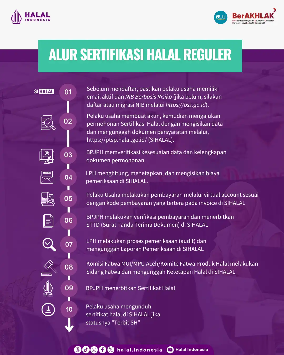 | Persyaratan | : | 1) Email aktif; 2) NIB (Nomor Induk Berusaha) Berbasis Risiko; 3) Pelaku Usaha memiliki akun SIHALAL; 4) Memiliki Penyelia Halal; 5) Dokumen Penyelia Halal (KTP, Daftar Riwayat Hidup, Sertifikat Pelatihan Penyelia Halal); 6) KTP Pelaku Usaha; 7) Email & Nomor HP Pelaku Usaha; 8) Menyiapkan dokumen-dokumen persyaratan SH Reguler. Dokumen-dokumen tersebut dapat diunduh di Dashboard Informasi BPJPH. Alur & Ketentuan Sertifikat Halal Reguler Ajukan Pendaftaran Sertifikat Halal Anda melalui tautan berikut: Ajukan Layanan Sertifikat Halal |